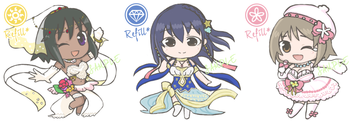 三村かな子(N、ふわふわスマイルSR、SR+)・島村卯月(SR)・大槻唯(サマースプラシュSR)・神崎蘭子(渚の天使SR+)/にゃい